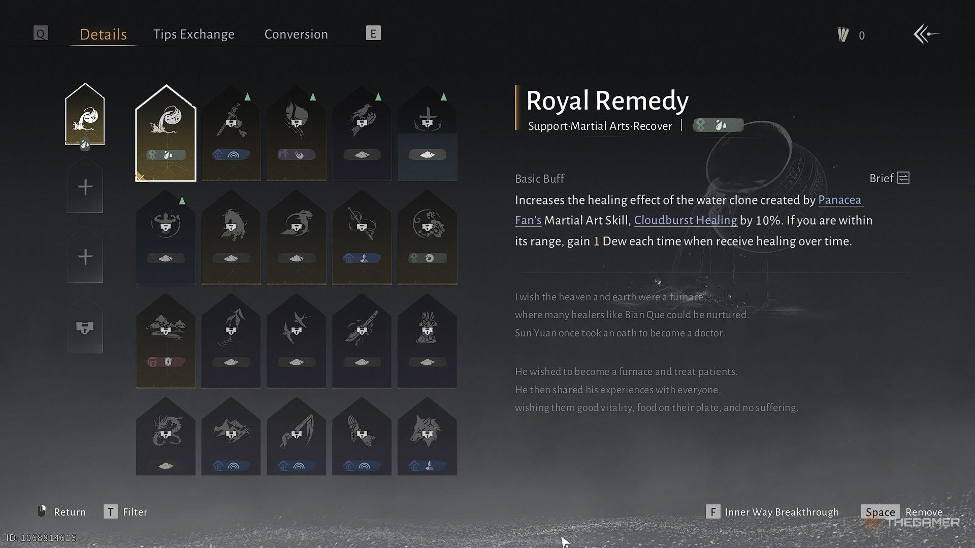 • Королевское средство. Эффект исцеления водного клона фаната Панацеи увеличен на десять процентов, и вы получите одну каплю росы при получении исцеления в пределах досягаемости.