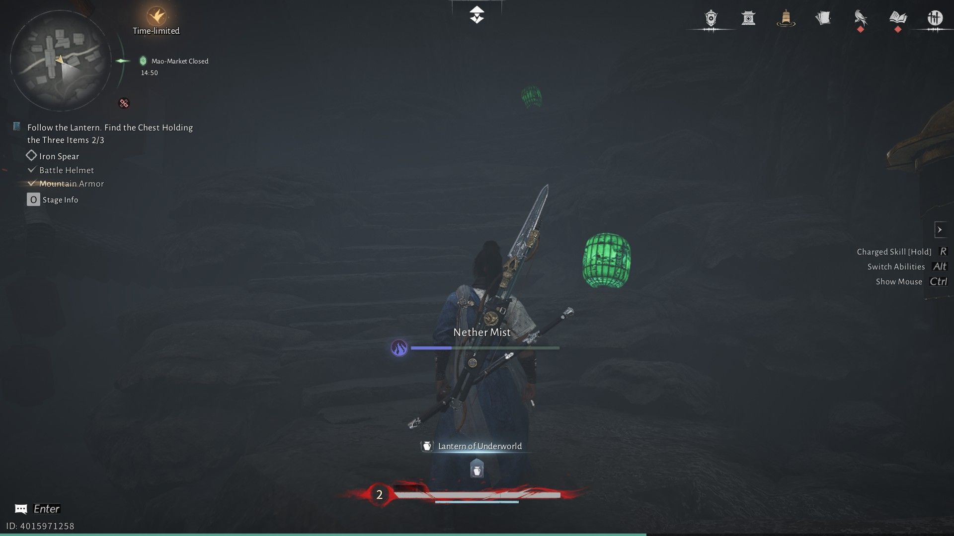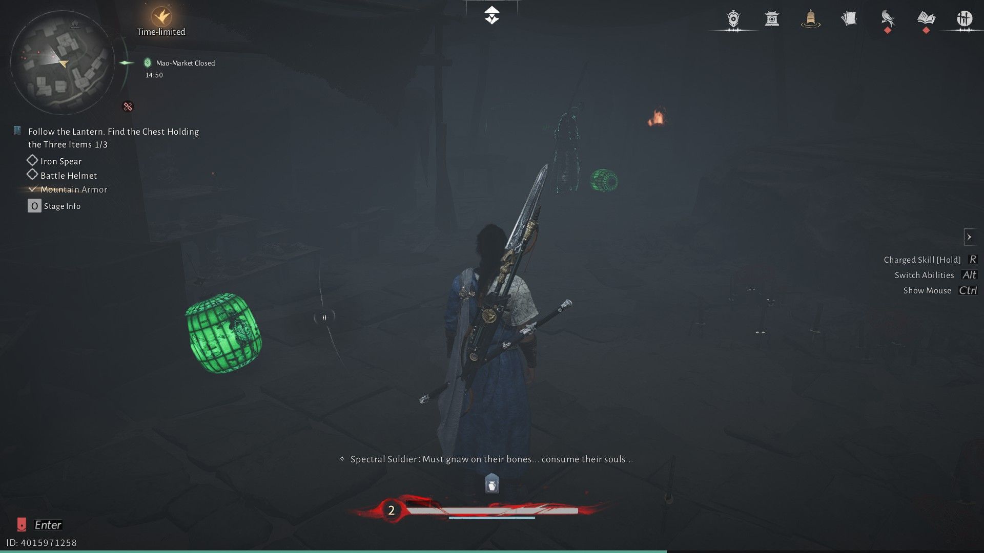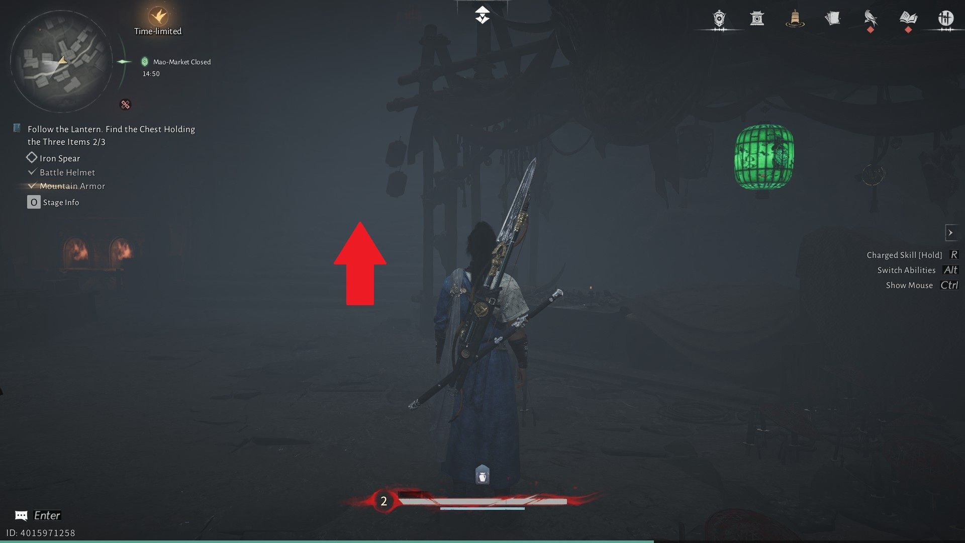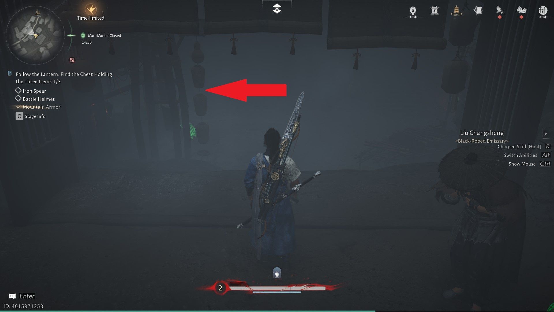 Когда вы доберетесь до жуткой зоны Рынка Призрачного Света, поговорите с Лю Чаншэном, который стоит возле лестницы. Ему понадобится ваша помощь, чтобы найти три вещи: броню, шлем и копье. Чтобы найти броню, начните с начала и направляйтесь направо. Продолжайте следовать за зелеными фонарями, пока не увидите Пограничный Камень и Чан Шэн, члена секты Девяти Смертных Путей в WWM.