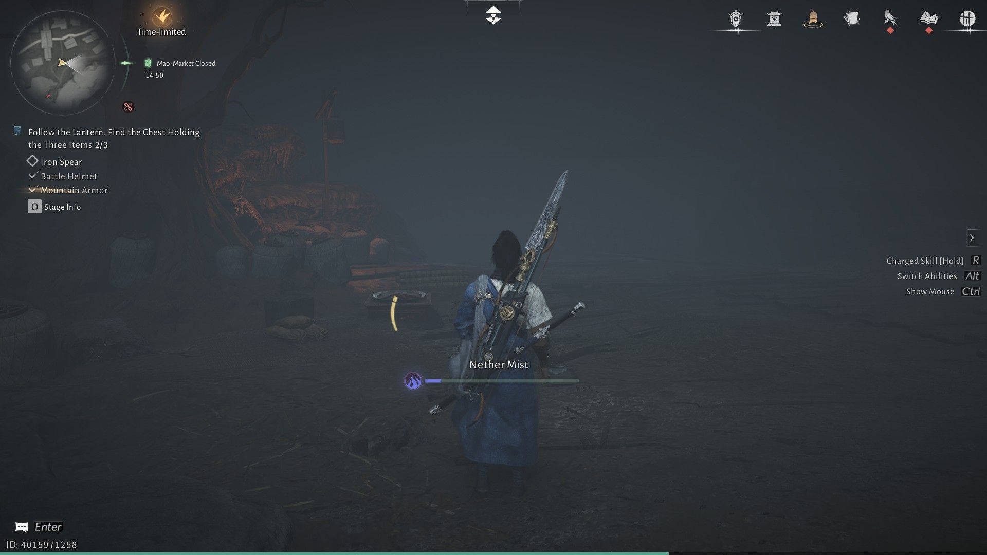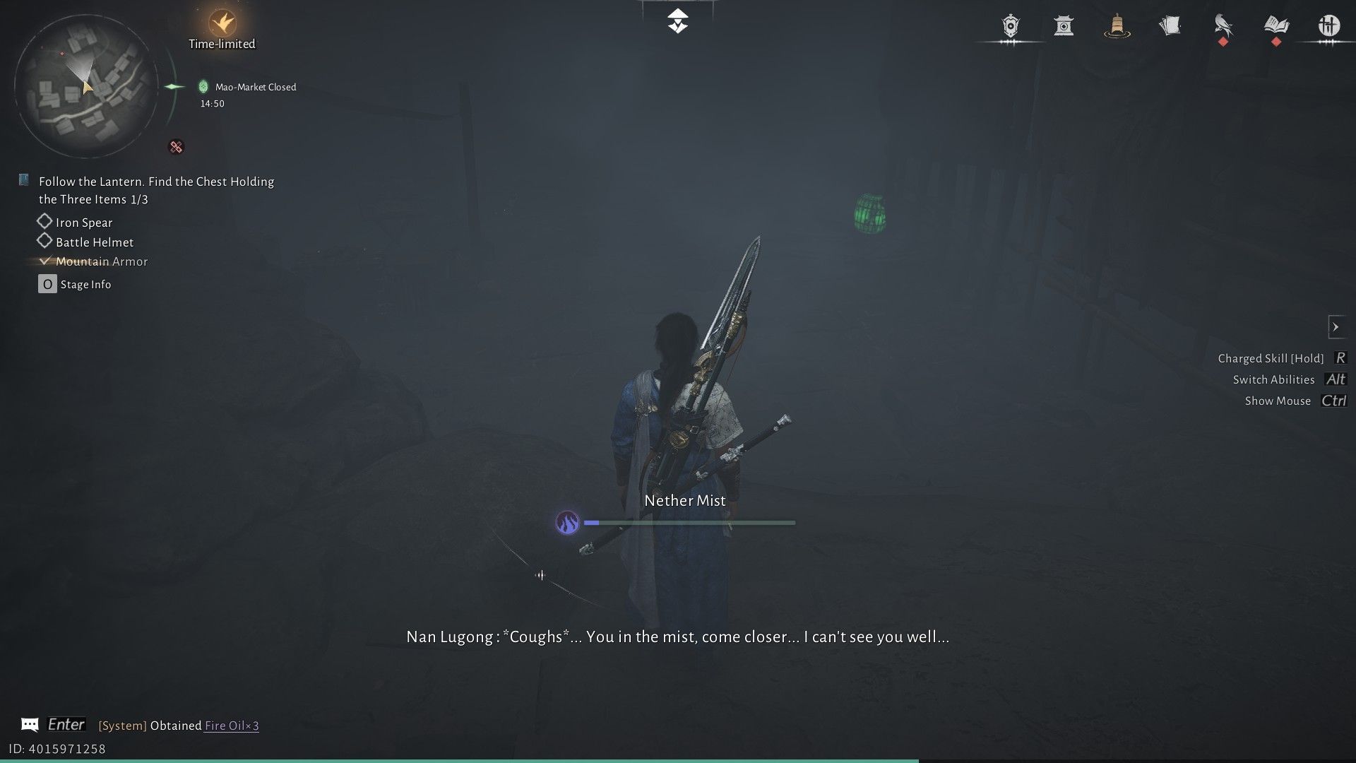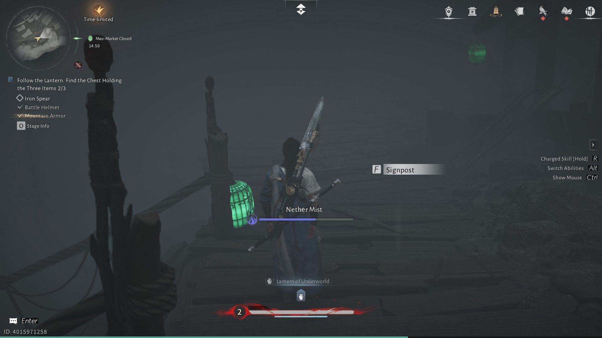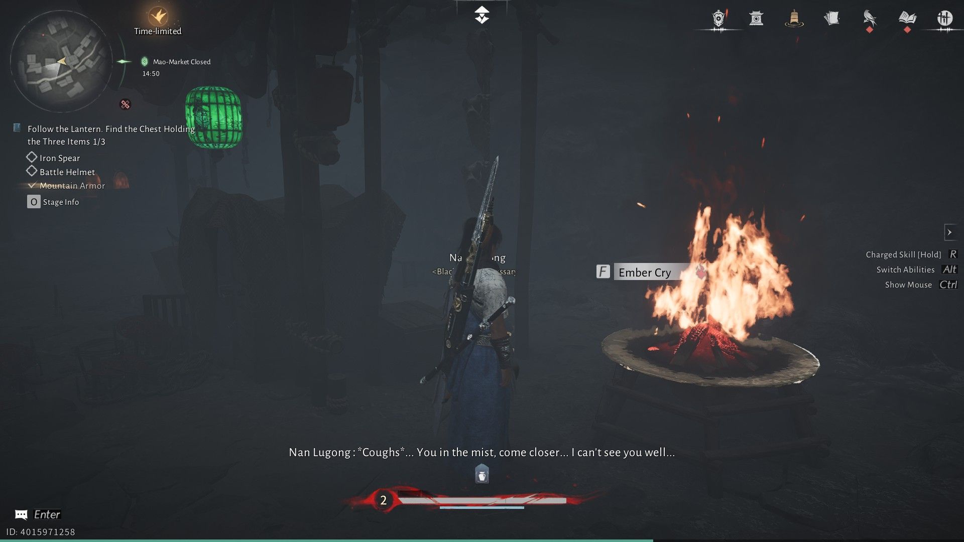 Когда вы доберетесь до жуткой зоны Рынка Призрачного Света, поговорите с Лю Чаншэном, который стоит возле лестницы. Ему понадобится ваша помощь, чтобы найти три вещи: броню, шлем и копье. Чтобы найти броню, начните с начала и направляйтесь направо. Продолжайте следовать за зелеными фонарями, пока не увидите Пограничный Камень и Чан Шэн, члена секты Девяти Смертных Путей в WWM.
