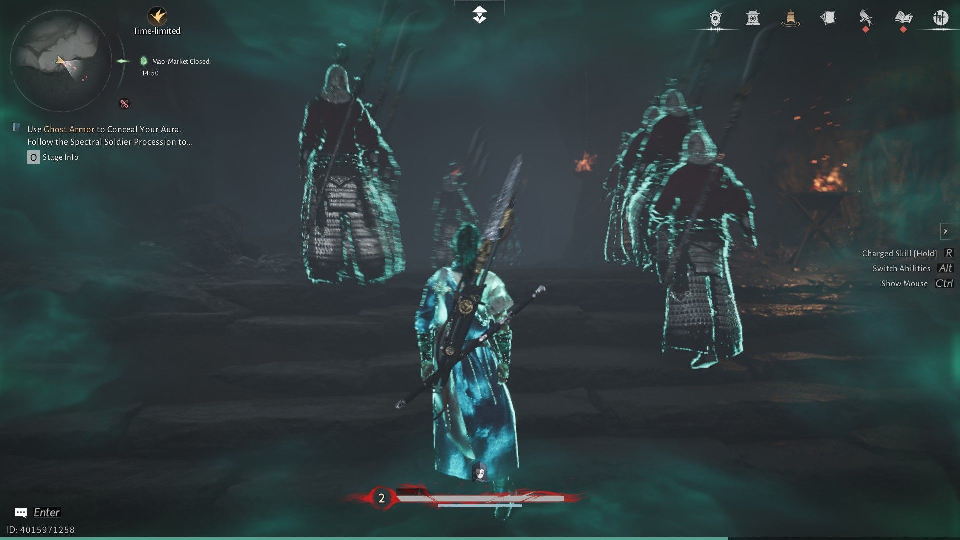 Вернитесь к Лю Чаншэну и наденьте найденное полное призрачное снаряжение. Игра проведёт вас через процесс экипировки. После того, как вы экипируетесь, дождитесь прохождения процессии призраков мимо начальной области, затем следуйте за ними через рынок. Они остановятся возле некоторых призрачных солдат, и как только это произойдет, вы сможете продолжить в следующую область, пройдя через каменные ворота.