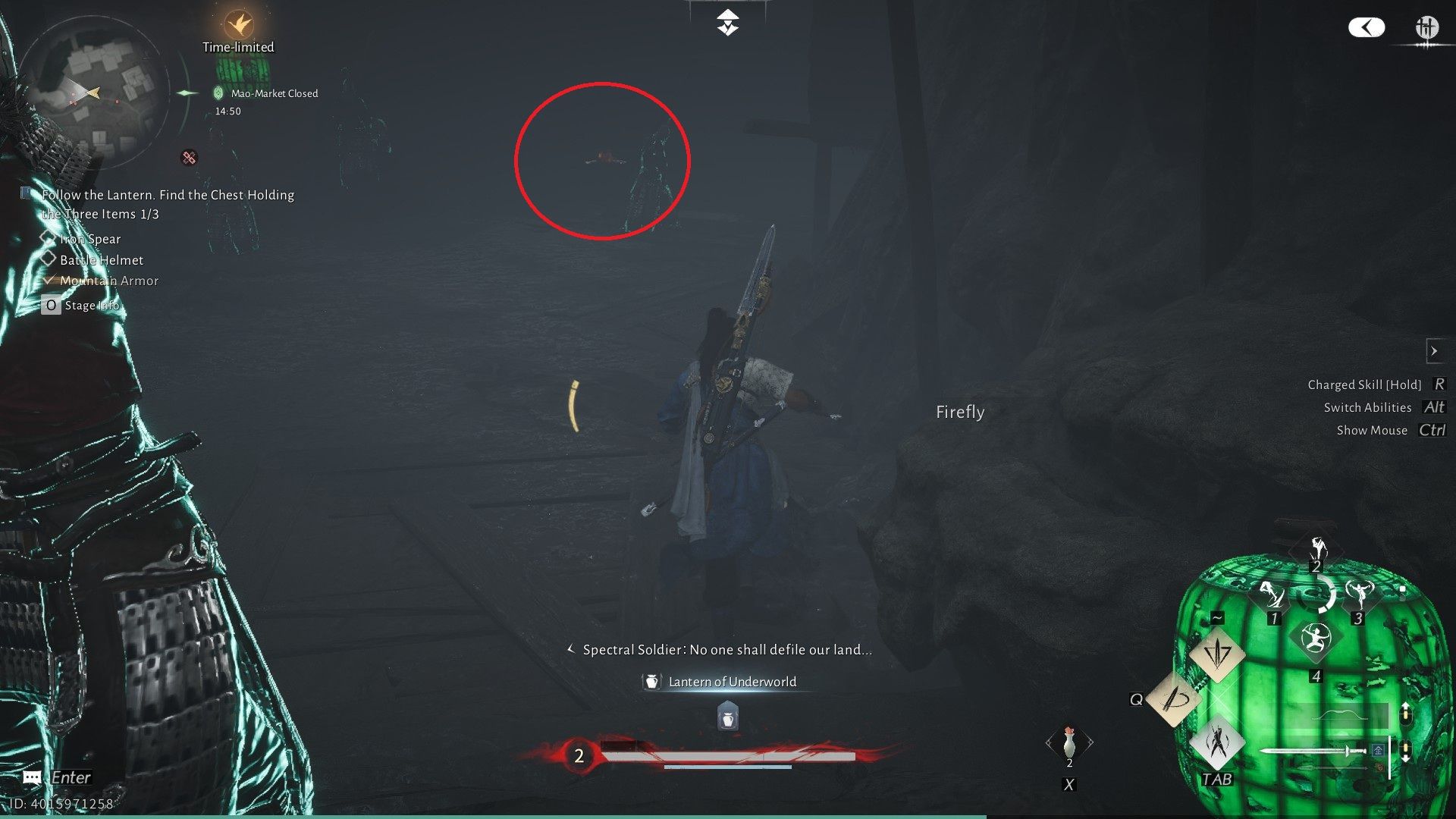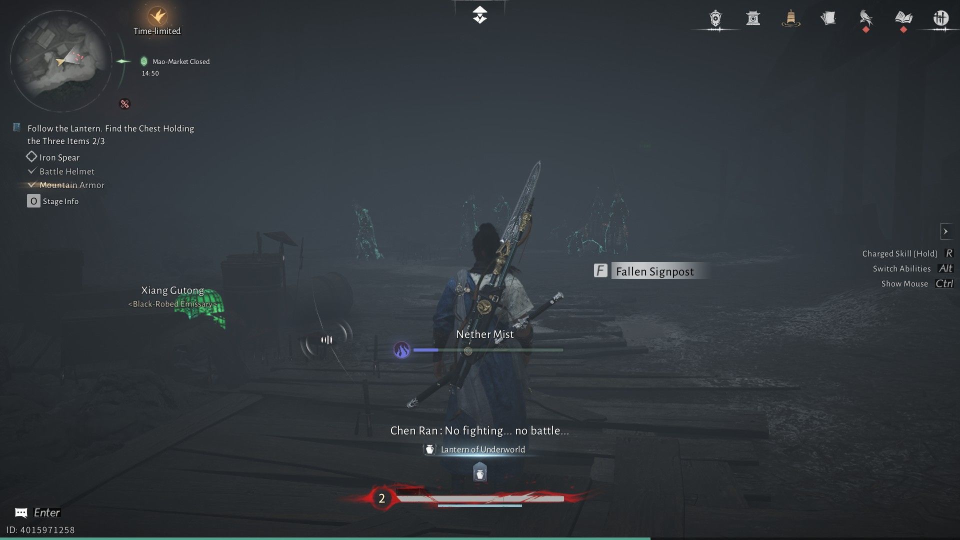 Когда вы доберетесь до жуткой зоны Рынка Призрачного Света, поговорите с Лю Чаншэном, который стоит возле лестницы. Ему понадобится ваша помощь, чтобы найти три вещи: броню, шлем и копье. Чтобы найти броню, начните с начала и направляйтесь направо. Продолжайте следовать за зелеными фонарями, пока не увидите Пограничный Камень и Чан Шэн, члена секты Девяти Смертных Путей в WWM.